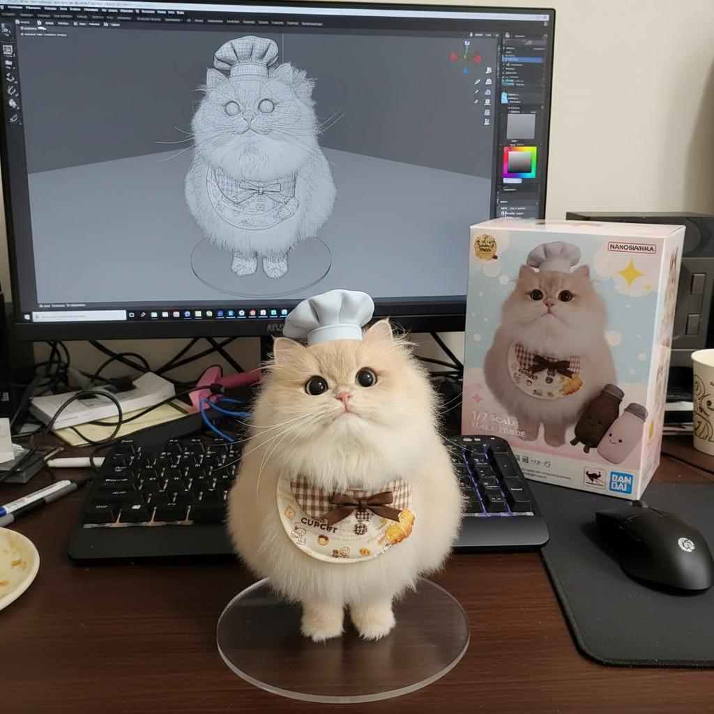将插画中的角色以1/7比例商业化手办化,采用写实风格与真实环境呈现。手办将置于电脑桌场景,搭配无文字的圆形透明亚克力底座,电脑屏幕同步展示ZBrush建模流程。